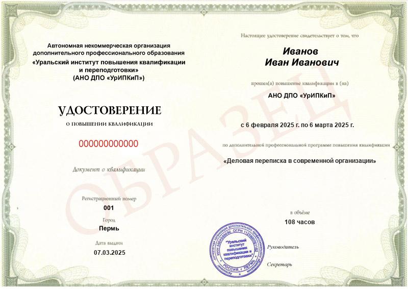 Заполненные образцы выдаваемых документов есть в описании учебных курсов и на странице «Лицензия. Документы», а также на главной странице официального сайта АНО ДПО «УрИПКиП».