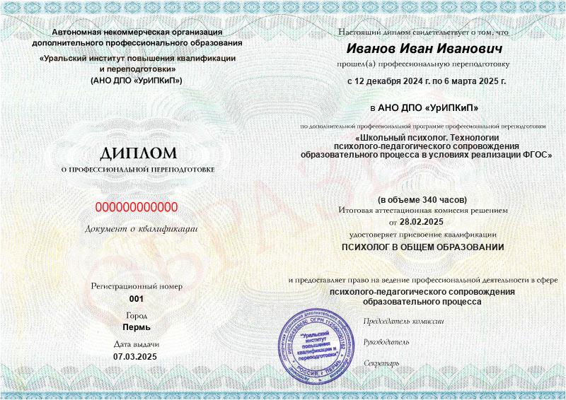 • Квалификация: Психолог в общем образовании